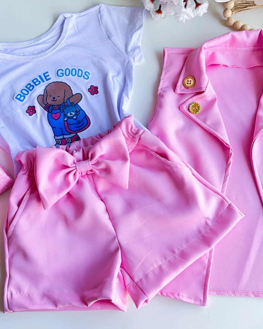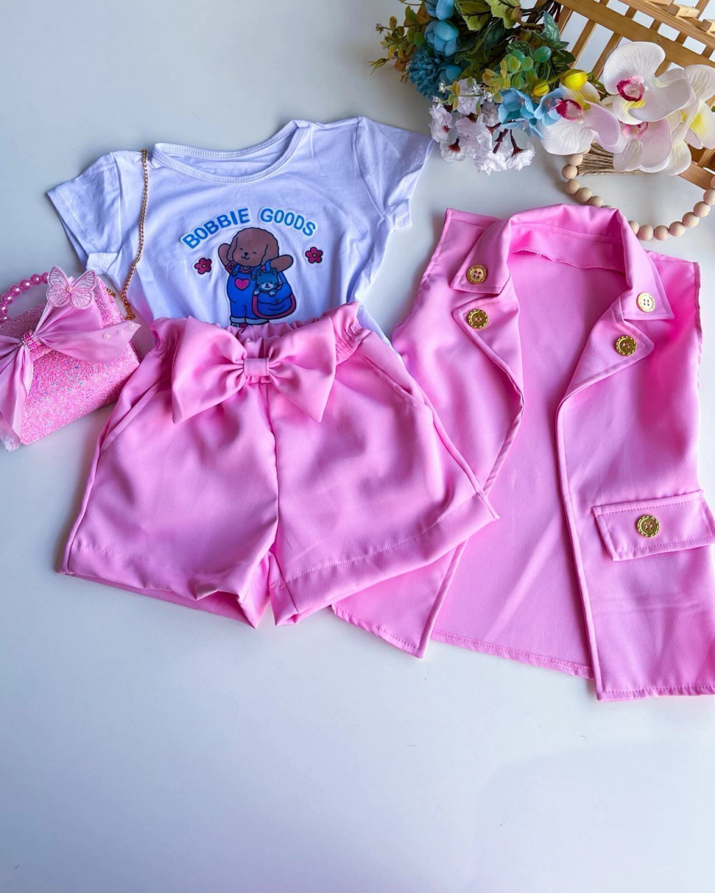 Descrição: Conjunto composto por camisa, short e colete. Camisa manga curta com estampa Bobbie Goods, golinha tradicional, abertura com botoes no colete. Short com tecido grosso e confortavel, com elástico na cintura, faixinha de amarração,lacinho que é um charme parte de trás sem detalhes. Modelo rico em detalhes, super curinga, podendo usar em qualquer ocasião, dando para usar as peças desmembradas, podendo compor vários looks incríveis!