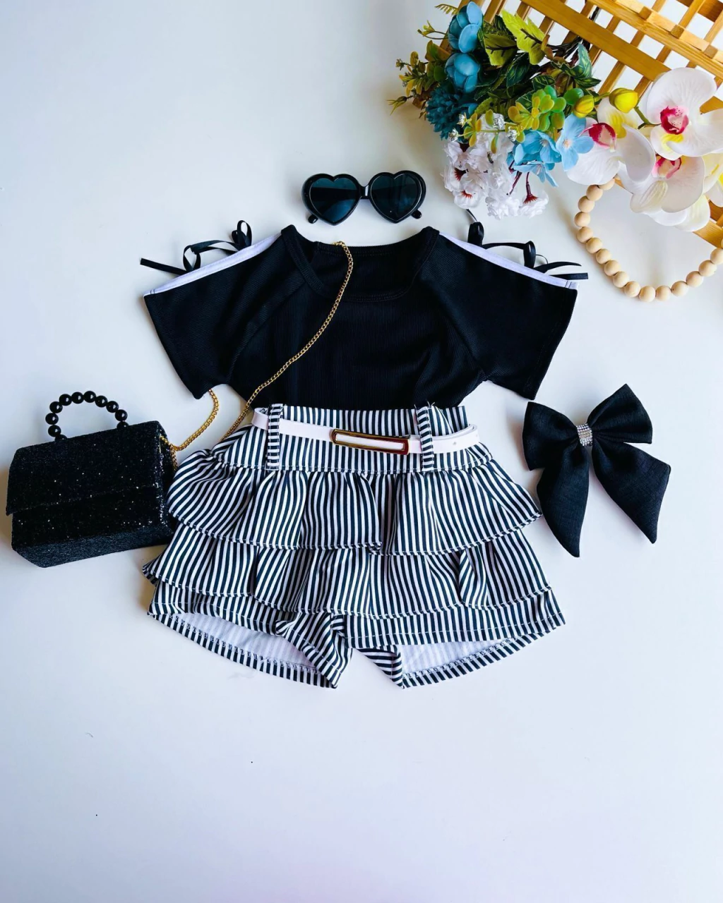 Descrição: Short saia com babado e cinto, com elástico na cintura, toda em babado, dando um efeito bem rodadinho. Modelo perfeito para sua pequena arrasar em qualquer lugar